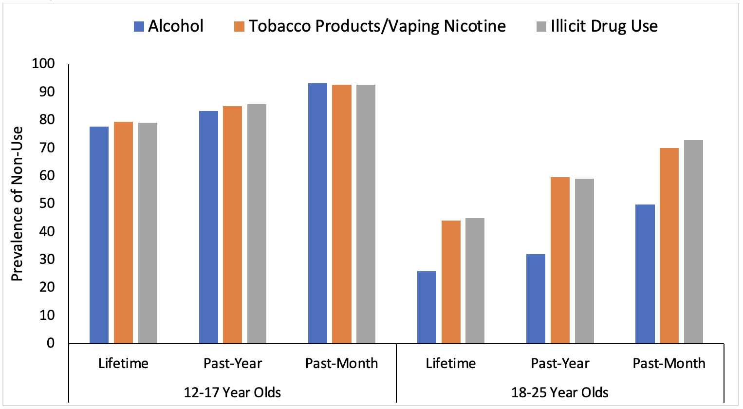 In addition, although it may run counter to the common narrative playing out in communities that young people are using substances, the reality is that the vast majority of adolescents do not use substances. In fact, according to SAMHSA’s NSDUH, among 12- to 17- year-olds in the U.S., 77.7% have never used alcohol, 79.4% have never used tobacco products or vaped nicotine, and 79.1% have never used illicit drugs (including cannabis or misuse of prescription drugs). The percentages of adolescents reporting no use in the past-year and the past-month are even higher (Figure 2).