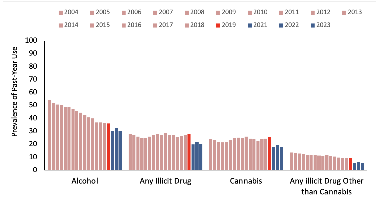 Figure 1. Prevalence of Past-Year Use Among 8th, 10th, 12th Grade Students, United States, 2004-2023
